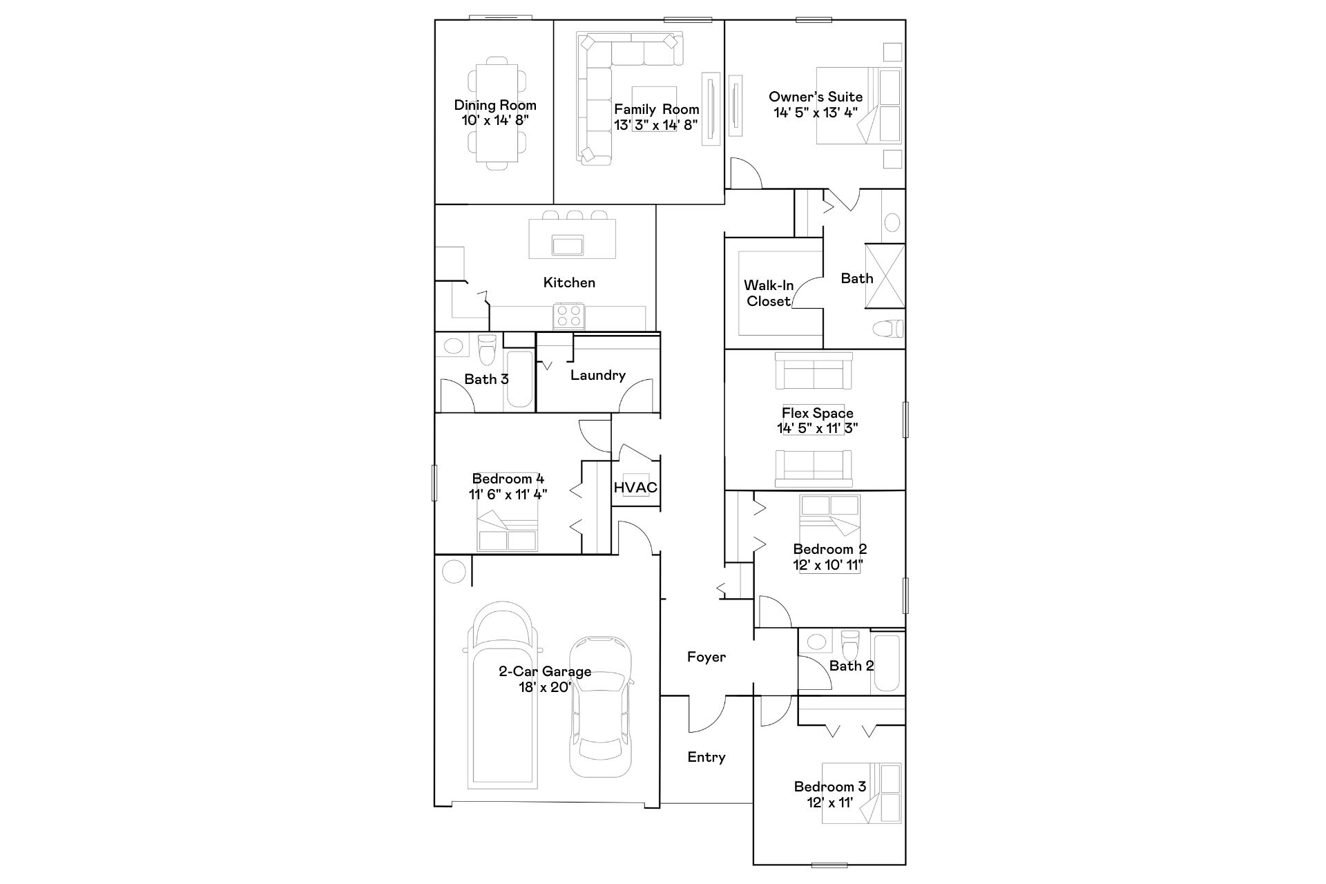 • Description: This single-story home shares an open layout between the kitchen, dining room and family room for easy entertaining. A luxe owner's suite is in the rear of the home and comes complete with an en-suite bathroom and walk-in closet. There are three secondary bedrooms at the front of the home, ideal for overnight guests or residents needing additional privacy, as well as a flex space that can transform to meet the household’s needs.