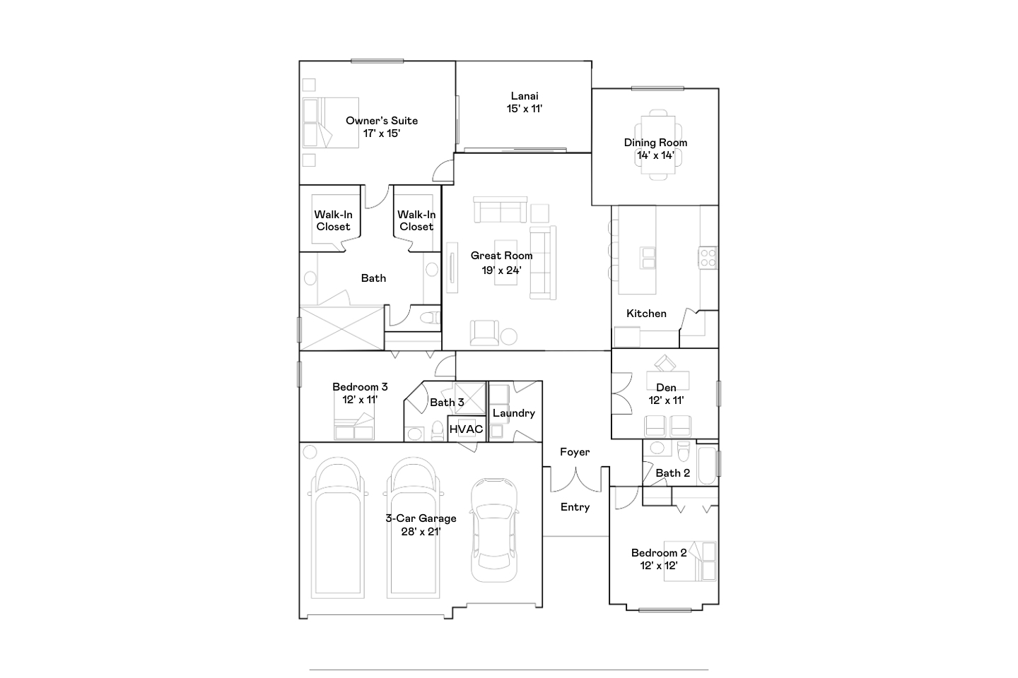 - Description: This spacious single-story home features an airy den off the foyer, followed by an open living space with access to a lanai for outdoor entertaining. In addition to the luxe owner’s suite, there is a secondary suite and a spare bedroom. A three-car garage offers extra storage or versatile needs.